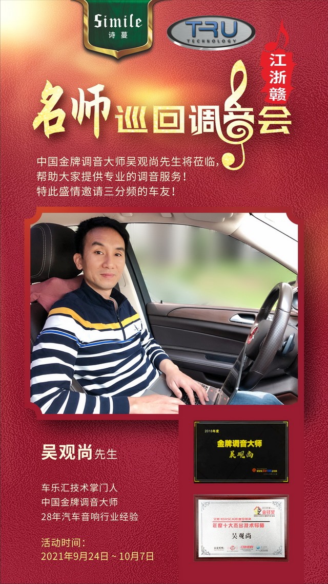 国庆长假,大家都浸润在快乐长假之中,而金牌调音大师吴观尚(下面简称尚总)和市场运营总监刘方吉(下面简称刘总),他们的快乐在于为广大汽车音响爱好响,发烧友进行调音服务,让车友听着优美的音乐出行,过上一个难忘而有意义的节假日。国庆前后,尚总刘总俩人足迹更是踏至江、浙、赣三省,行程五千公里,历时15天。同时,这也是车友装德国诗蔓,美国TRU音响粉丝的福利。经过尚总的调音,让他们真正领略到专业汽车音响的魅力所在。